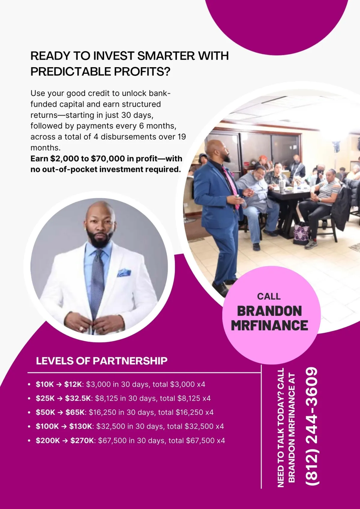 Leverage your good credit to access bank-backed funding that delivers structured returns—starting with your first payout in just 30 days, followed by additional payments every 6 months, for a total of 4 disbursements over 19 months.